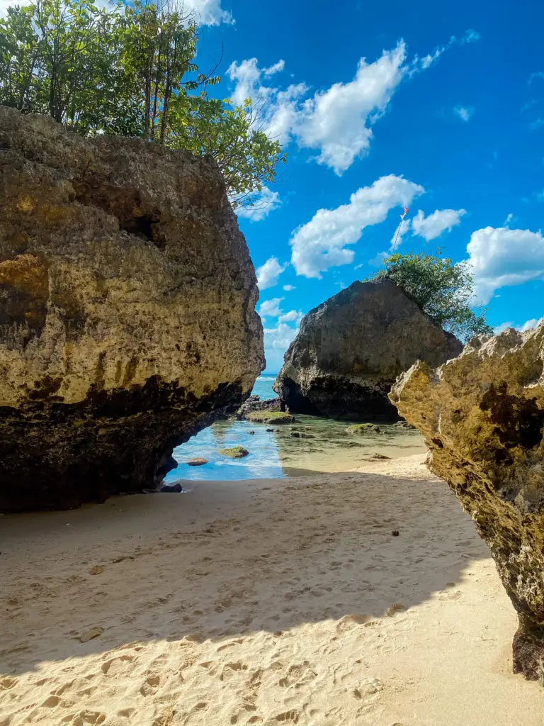 To get to the beach you have to walk through a temple, down a small set of stairs and through a rock crevice. It is quite breathtaking.