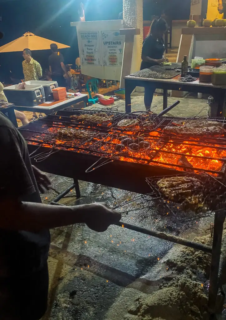 The Lucky Fish Lounge has tables down on the beach and each night they host a seafood BBQ with coolers of fresh fish where you walk up and choose the fish you want, they weigh it and charge you based on the weight. I loved this experience!